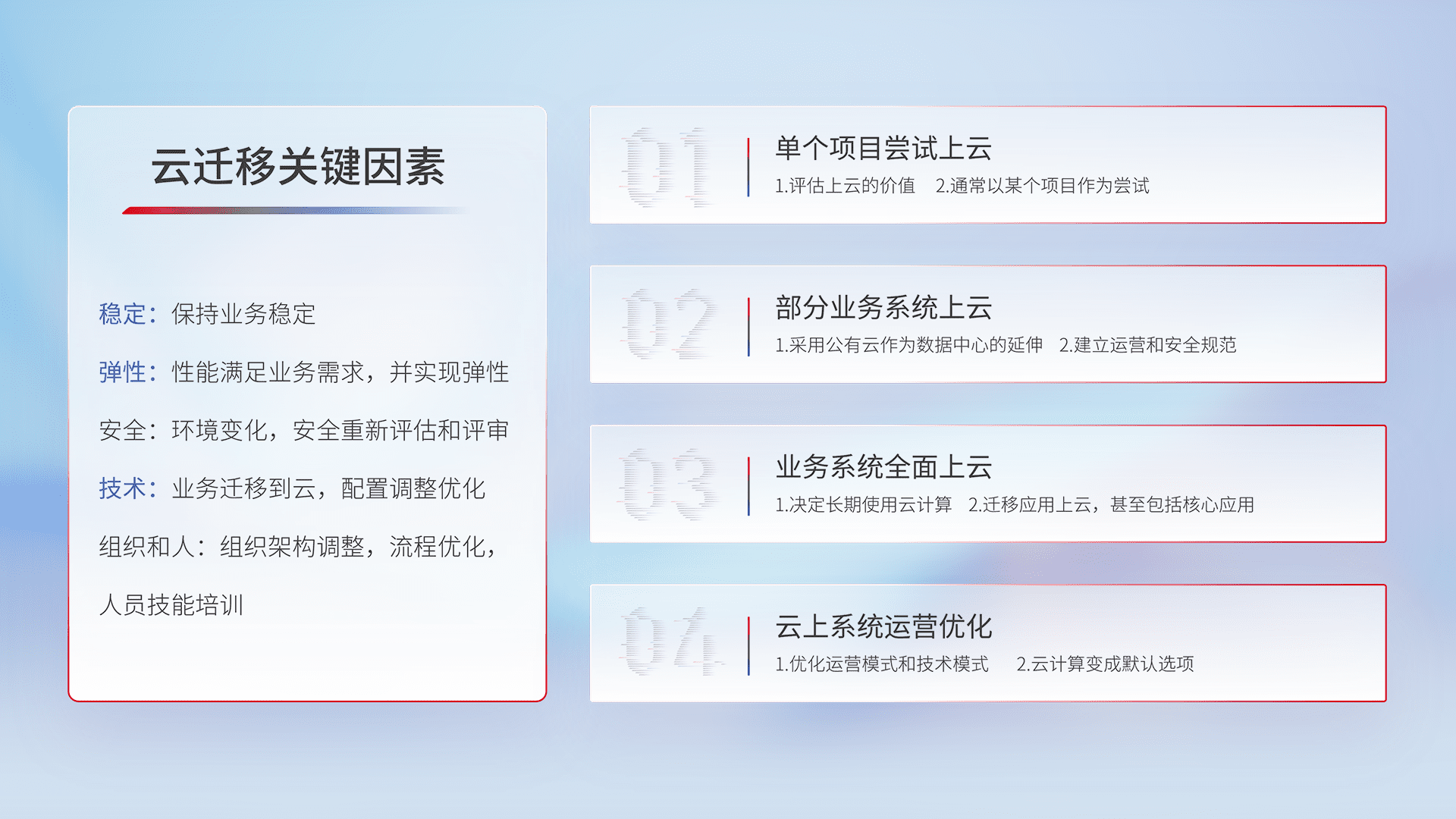 结合实际业务,,从规划设计、、云平台选型、、、、云原生改造、、、数据迁移、、集成交付,,,,迁移全过程为客户识别最佳上云路径,,,,做好风险识别管理,,设计网络架构、、身份权限、、安全审计合规、、、操作审计、、日志审计、、监控告警策略、、、、多站点容灾设计等,,对云上基础设施进行整体规划,,提升IT治理水平,,,以满足弹性、、、、高可用、、、、高性能的需求。。。