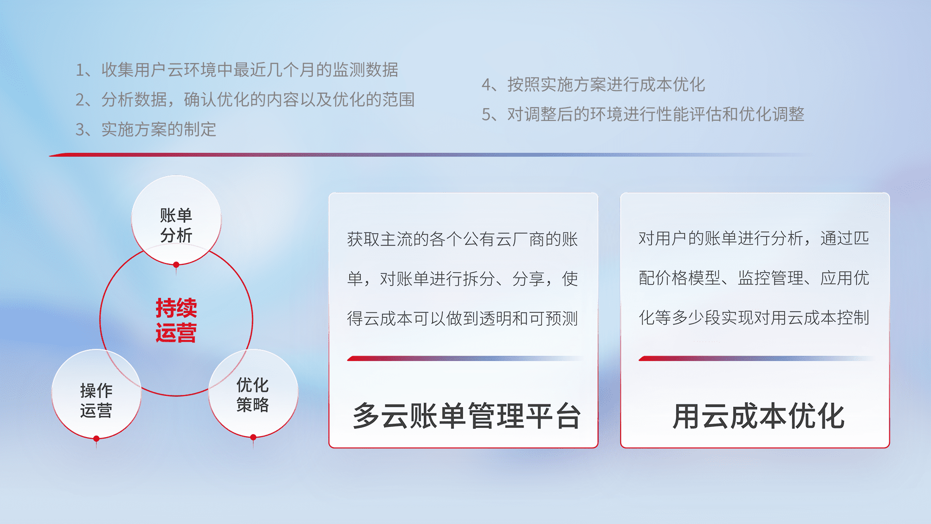 通过多云纳管,,,以统一的资源数据模型把客户的云资源进行抽象和封装,,,进而实现对多云资源的统一操作,,保障云资源管理的可靠性、、、稳定性与可用性。。量身定制化运维内容,,配置、、、、开发运维、、补丁管理、、、备份、、、、监控、、、、认证和访问管理、、审计和日常巡检等,,,,保障在用云过程中的可靠度,,稳定度以及高可用率。。